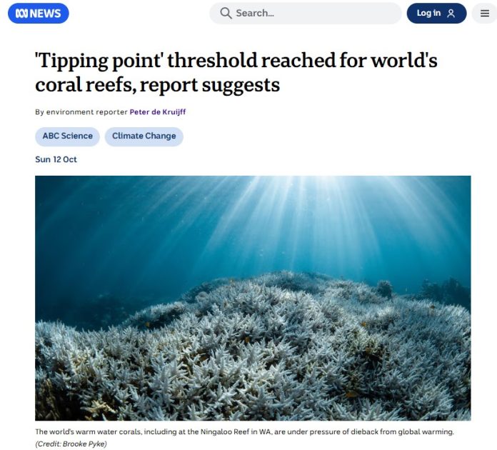 Editor’s Note: Purported climate change tipping points are much in the news around the world. From ABC News in Australia, as the guest post below explores, to here in the United States with CNN’s story, “The planet has entered a ‘new reality’ as it hits its first climate tipping point, landmark report finds.” The new spate of stories stems from a report pronouncing the climate change induced death of coral reefs. Climate Realism has debunked claims that such tipping points exist and have been identified in multiple posts previously, here, here, and here, for example.