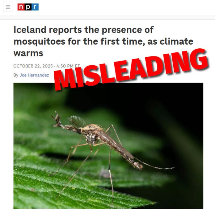 In short, NPR’s article takes a mundane occurrence—a few stowaway insects—and turns it into a symbolic tale of how climate change is causing previously unexperienced deleterious changes. While NPR blames global warming for newly arrived mosquitoes in Iceland, the evidence points squarely to increased global shipping, not melting glaciers.
