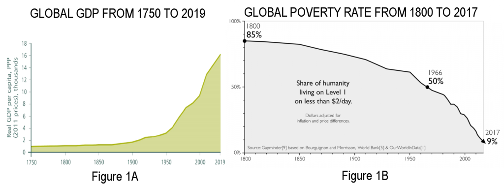 If fossil fuels were the “existential threat” Al Jazeera claims, the past century of unprecedented human progress would be inexplicable. Since 1750, global GDP has grown by more than 3,000 percent seen in Figure 1A, and extreme poverty has plummeted from more than 80 percent of humanity in 1800 to less than 10 percent in 2017, seen in Figure 1B.