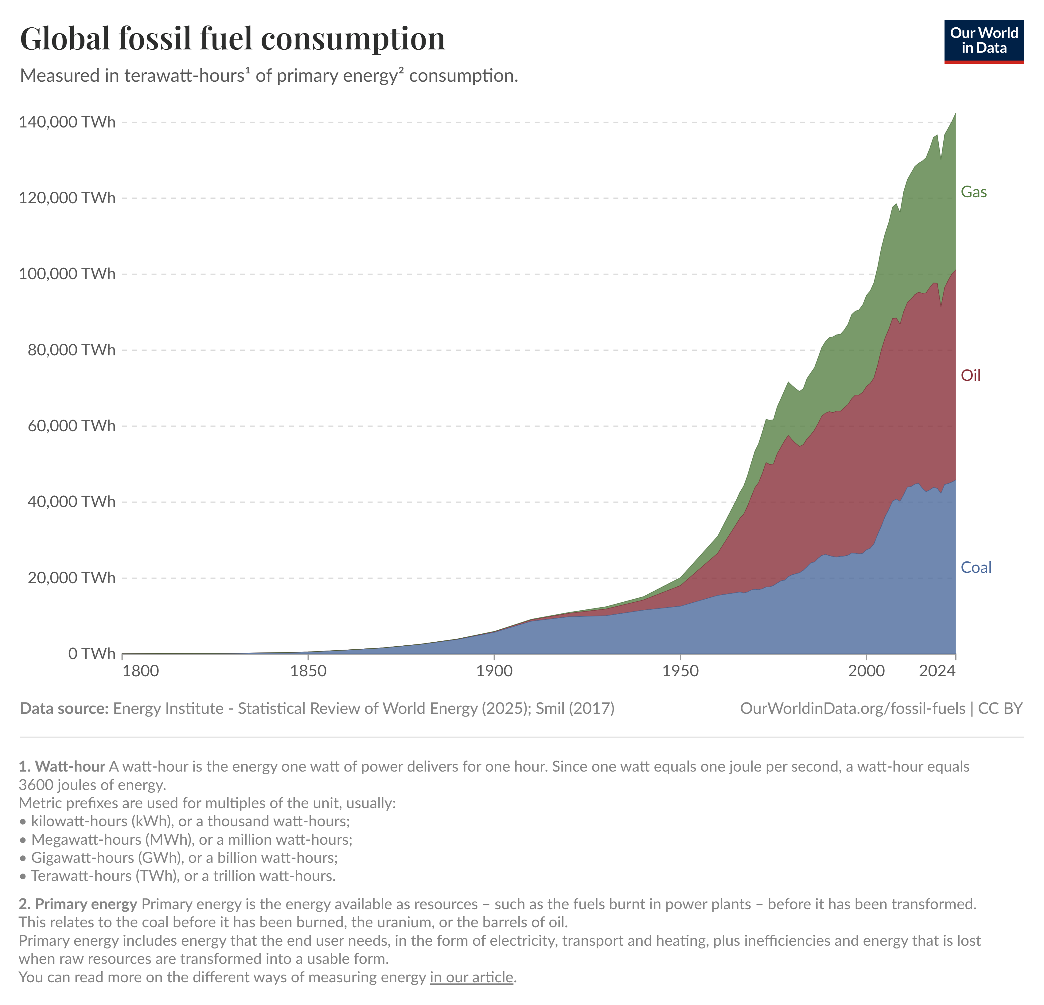 This global transformation to our modern society coincided precisely with global fossil fuel consumption, seen in Figure 2 below: