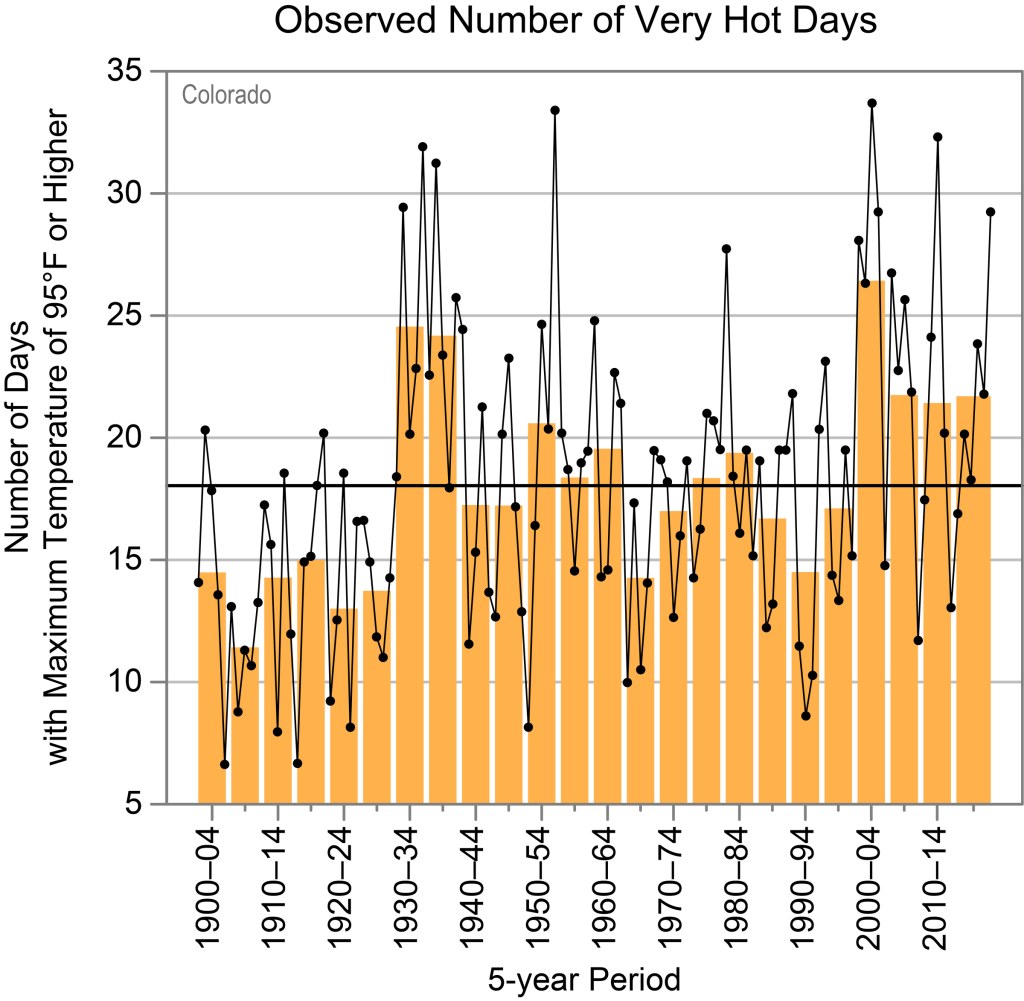 Colorado is one of the few states where the number of very hot days (days with temperatures over 95°F) has increased in recent years; however, it’s no worse than it was during the 1930s and 1940s, according to data on Colorado’s weather history from the National Oceanic and Atmospheric Administration (NOAA). (See figure below)