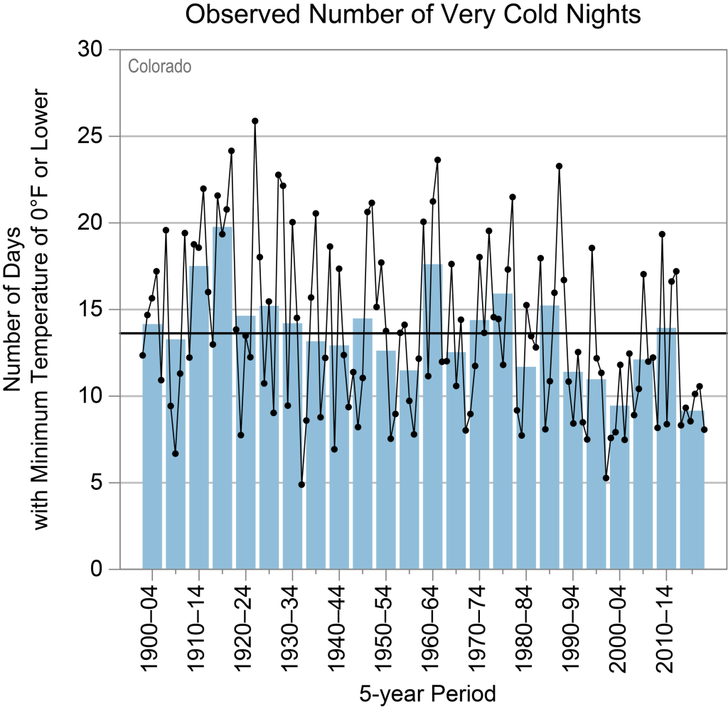 Nowhere in the article is extreme cold mentioned, which is notable, because deaths due to extreme cold are declining as the planet has slightly warmed over the past hundred-plus years. In fact, data on heat-and-cold related mortality show that the number of deaths due to extreme cold have declined at a faster rate than deaths due to heat have increased over the same time period. Estimates say that as many as 20 times more people die of cold than heat. This means that global warming has actually been a net life saver, rather than killer. And indeed, extreme cold instances have declined in Colorado over the years even more consistently than highs have increased. (See figure below)