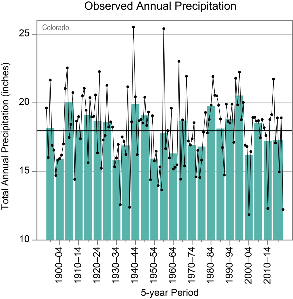 Regarding TCS’s claims about drought, there is little to no evidence that rainfall related drought is striking Colorado more frequently than usual in recent years, or that recent droughts have been more severe than in the past. Data show no consistent decline in precipitation over time. (See figure below)