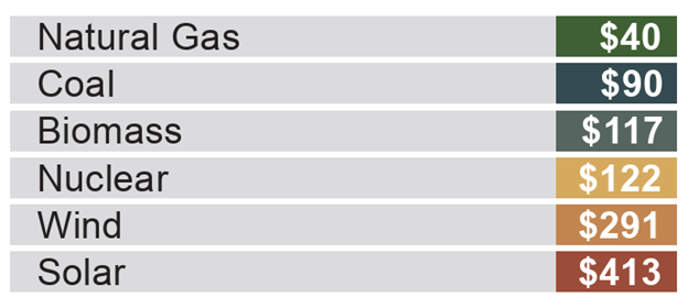 Fossil fuels are cheaper, more reliable, and more energy dense than renewable energy sources. Mainstream media outlets regularly claim that renewables like wind and solar are cheaper because their “fuel” –the wind and sunlight—are free. That’s true but largely irrelevant. The collection of that energy is not free, not even close. The most commonly referenced metric for the cost of different energy sources is the Levelized Cost of Electricity (LCOE). However, the LCOE measurement ignores many of the major costs that are unique to intermittent resources like wind and solar. These include special subsidies only they receive via renewables credits, the cost of backing the power up for when the wind doesn’t blow and the sun doesn’t shine, massive overbuilding, and transmission costs to remote areas.