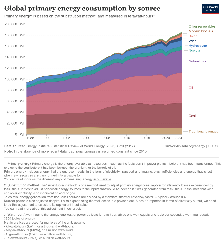 Exxon is right, with the truth of their comments being reflected in the growth of all fossil fuels as a primary energy source (see figure below).